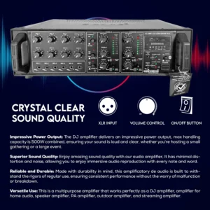The DJ amplifier delivers an impressive power output, max handling capacity is 500W combined, ensuring your sound is loud and clear, whether you’re hosting a small gathering or a large event. |