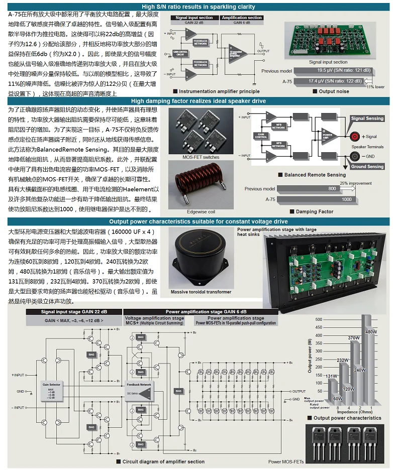The A-75 includes an upgraded version of the "MCS+Circuit" primary slow charging amplifier circuit equipped with "MCS" and an improved version of the multi-stage Parallel circuit design, combined with current feedback design, ensures linear response of each level. The amplification unit circuit is connected in parallel to reduce noise. A DC stabilized power supply is installed in the drive section and MCS+circuit to improve SN ratio and enhance sound purity.